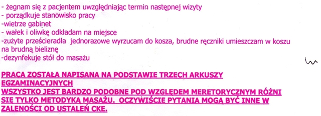 Witam ja mam takie pytanie. Słyszałem iż w tym roku moze pojawic sie na etapie praktycznym zadanie z masażu segmentarnego.jak powinna wyglądać taka praca ktora by zdala ten ze egzamin?Prosiłbym o pilną odpowiedż .Z gory dziękuje i pozdrawiam.