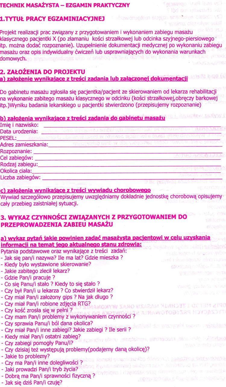 Osobiście zdobyłem 77 % w projekcie umieściłem wszystkie informacje zawarte w tym wzorze. Brak tylko opisu ćwiczeń ale myślę,że to rzecz indywidualna trzeba przyłożyć się trochę z kinezy co i jak napina rozluźnia. Jeśli chodzi o moje doświadczenie na egzaminie to radze pisać więcej jeśli nawet nie jesteśmy pewni czy dobrze opisujemy dany obszar.